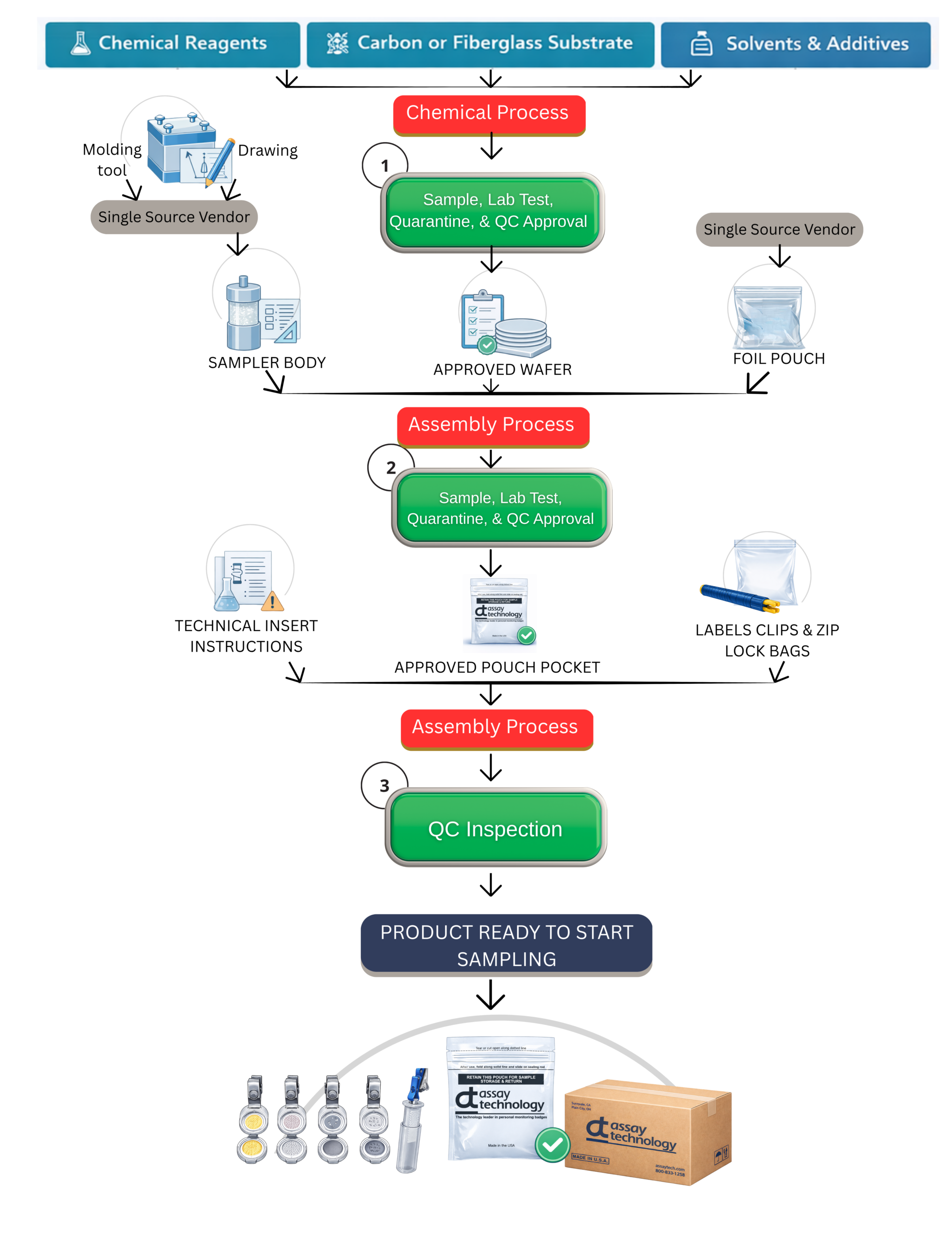 Although formal GMP regulations do not specifically apply to workplace health and safety sampling devices, Assay Technology follows many of the same principles. This approach reflects both the company’s internal standards and the experience of employees who previously worked in medical manufacturing environments where these practices are standard.