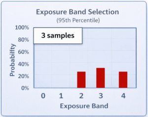 As an example, before you take any samples, you have a 20% probability of being in each of the 5 Exposure Bands (see left). After you have collected a small number of samples (see right), the IHDA will likely report a significant probability of being in each of several Bands. Since you have equal probability of being in several bands, you won’t be sure which band you are in, as yet.