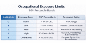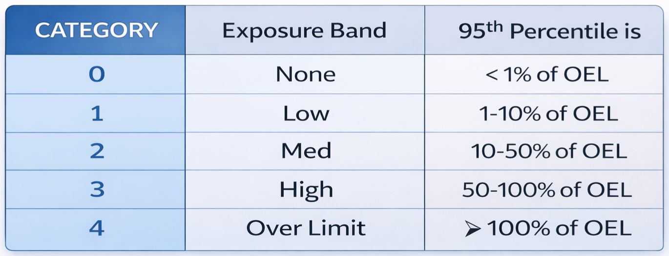 As part of its overall system, the possible exposure range are classified as 5 Categories or Exposure Bands, relative to the selected OEL, as follows.